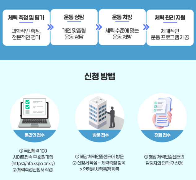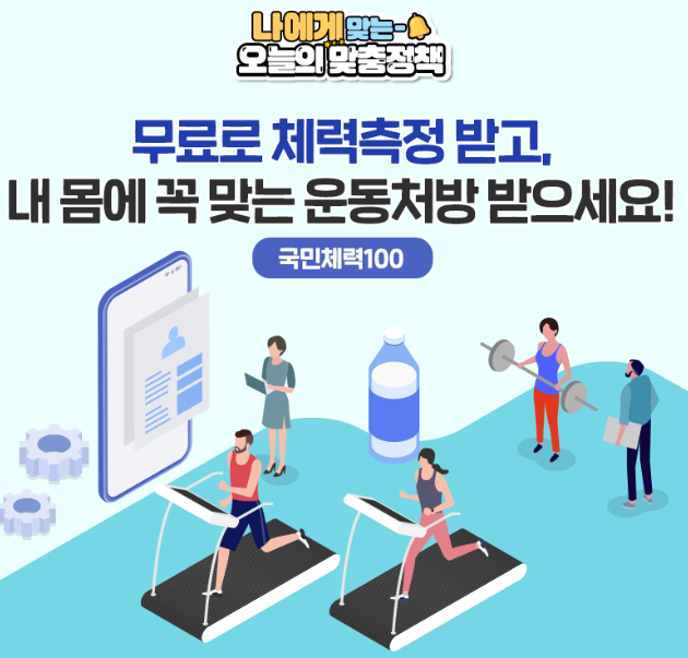 국민체력100은 국민의 체력 및 건강 증진을 목표로 체력 상태를 과학적으로 측정·평가하고, 개인별 맞춤형 운동 상담 및 처방을 제공하는 국가 공인 스포츠 복지 서비스입니다.