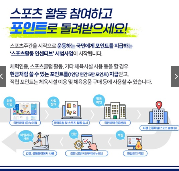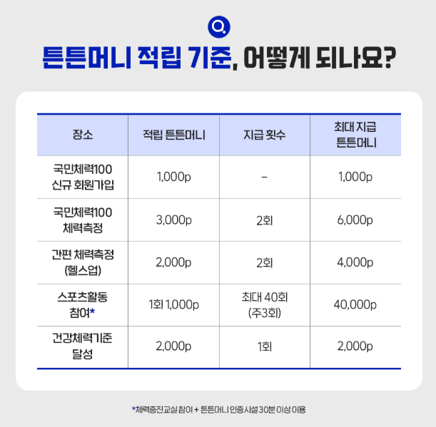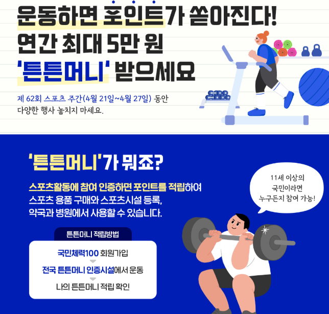 이번 글에서는 국민체력100 체력인증센터와 튼튼머니 포인트 적립 센터에 대해 소개해드리겠습니다.
