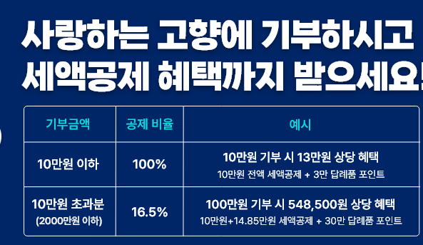 여기에 더해 세액공제 혜택과 함께, 지역 특산물로 구성된 고향사랑기부제 답례품까지 받을 수 있어, 기부자에게도 충분한 보상이 주어집니다.