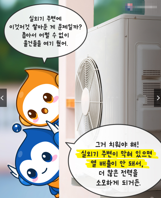 박스, 화분, 빨래건조대 등 실외기 주변을 막는 물건은 냉방효율을 떨어뜨리고 전기요금은 늘리는 주범이에요.