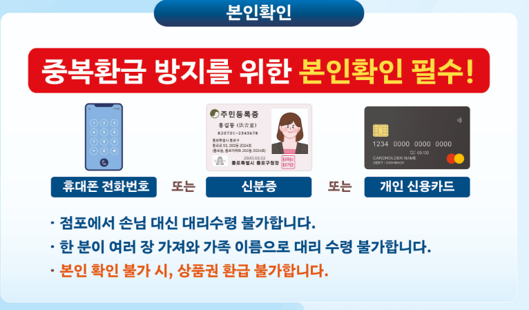 환급을 위해서는 구매 영수증과 신분증(또는 휴대전화)를 반드시 지참해야 하며, 다음 기준에 따라 지급됩니다.